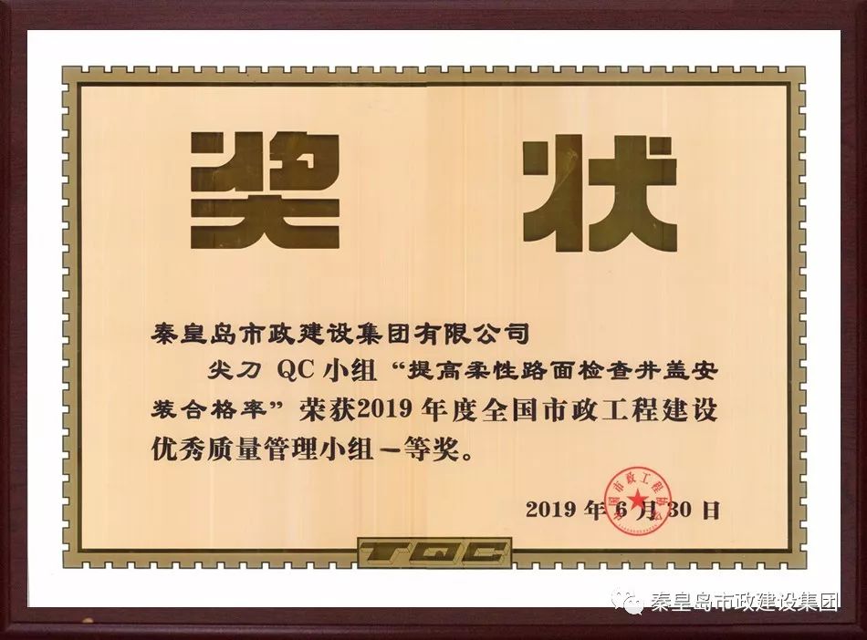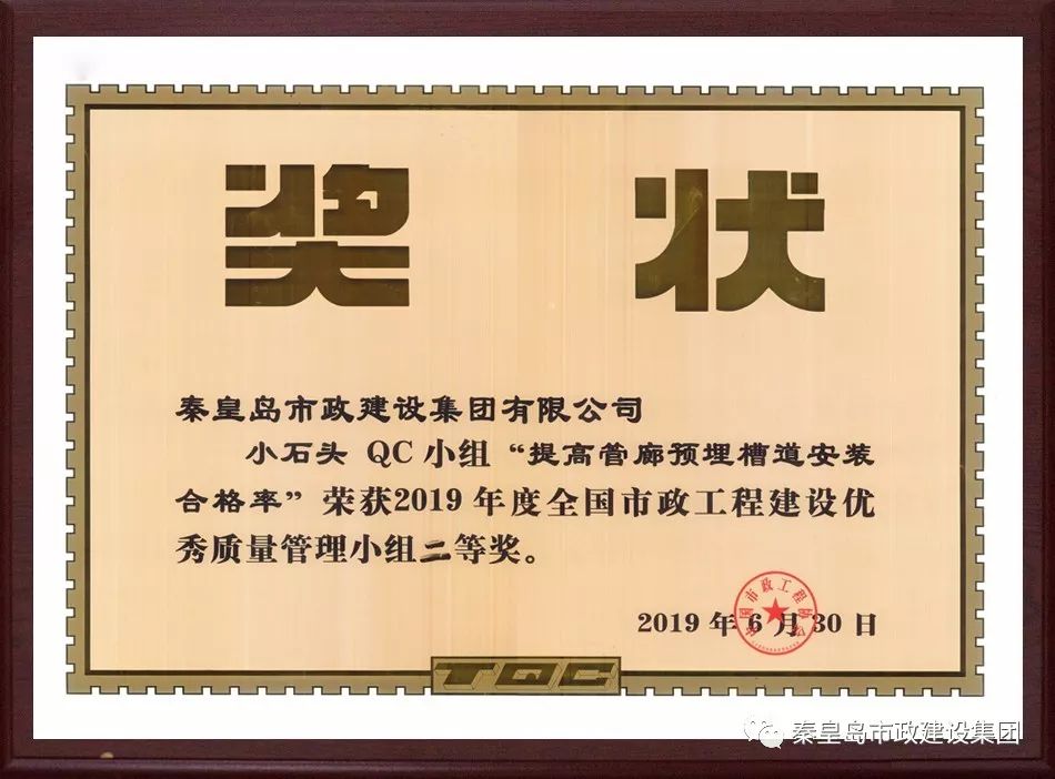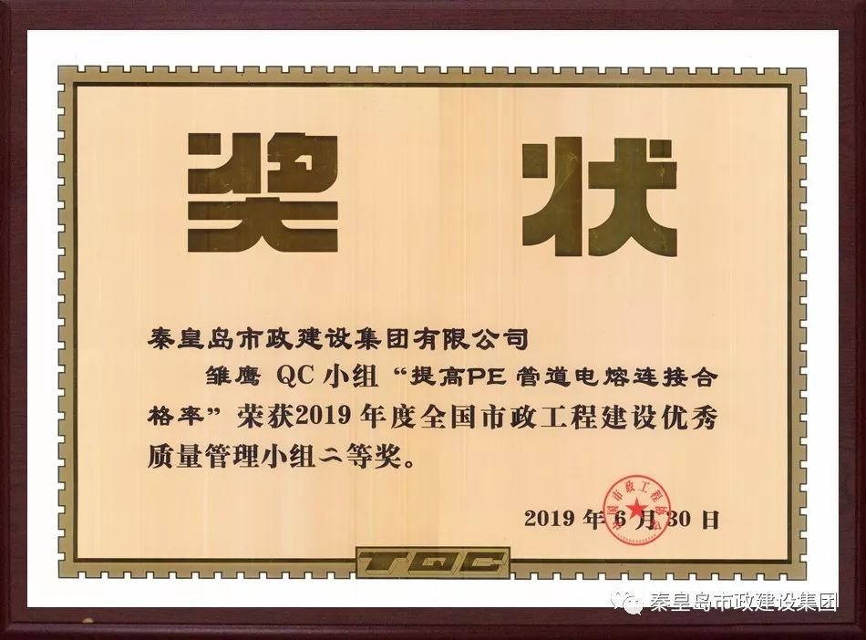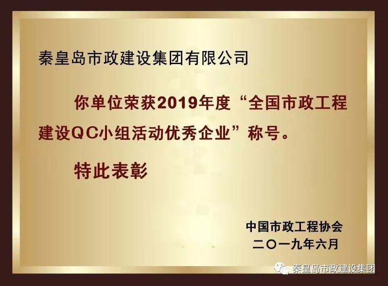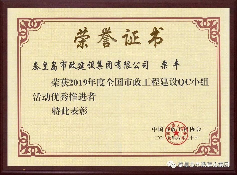 和信基業(yè)旗下秦皇島市政建設集團有限公司榮獲“2019年度全國市政工程建設QC小組活動優(yōu)秀企業(yè)”的榮譽稱號、集團總工程師栗豐獲得“全國市政工程建設QC小組活動優(yōu)秀推進者”的榮譽稱號。
