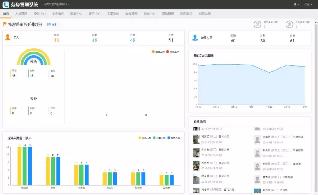 在勞務(wù)管理方面:目前已將在場(chǎng)的施工人員信息錄入勞務(wù)管理系統(tǒng),將人員的信息、接受教育情況、繳納保險(xiǎn)情況等信息生成二維碼。項(xiàng)目部通過(guò)掃描二維碼的形式進(jìn)行人員的考勤,以了解施工現(xiàn)場(chǎng)的人員出勤率和勞動(dòng)力使用情況。