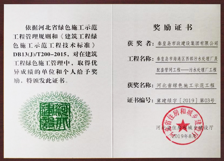 市政建設(shè)集團承建的秦皇島市海港區(qū)西部污水處理廠及配套管網(wǎng)工程——污水處理廠工程被評為河北省綠色施工示范工程。此項工程也是我市首個獲此殊榮的施工工地。