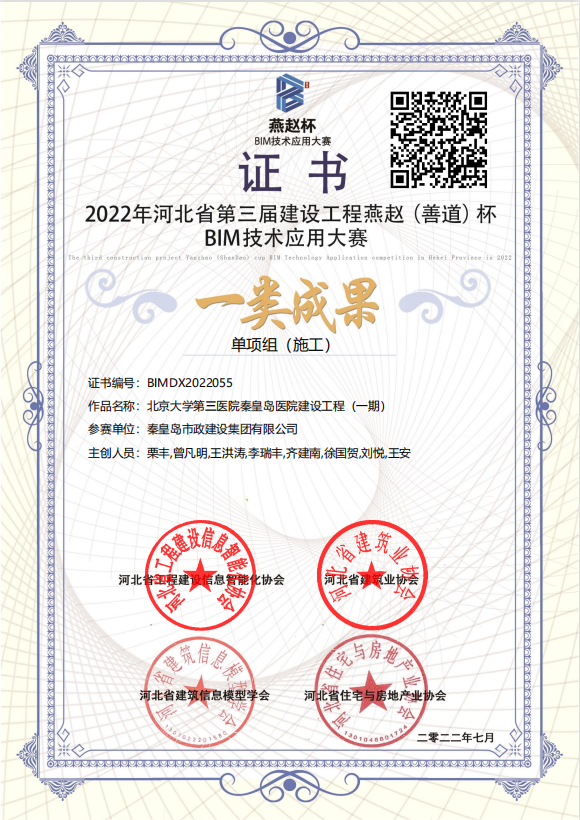 北醫(yī)三院秦皇島醫(yī)院項目喜獲2022年河北省第三屆建設工程燕趙(善道)杯BIM技術應用大賽單項組(施工)一類成果獎。